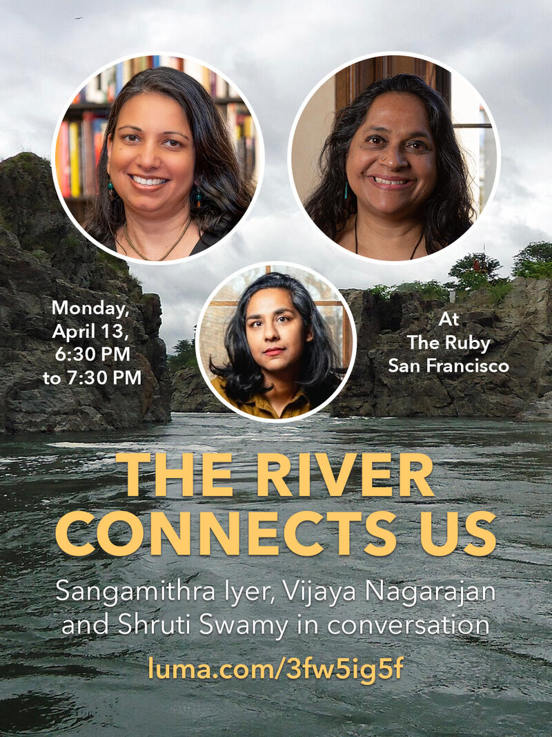 Join Sangamithra Iyer in conversation with Vijaya Nagarajan and Shruti Swamy at The Ruby San Francisco for “The River Connects Us,” discussing their work in the interwoven lives of plants, humans, and animals, an attention to the sacred, and explorations of ancestral knowledge. Books will be sold by Medicine for Nightmares.