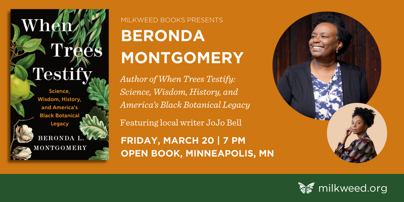 Milkweed Books is thrilled to present Beronda Montgomery, in Minneapolis to launch her new book, When Trees Testify: Science, Wisdom, History, and Americas’s Black Botanical Legacy. Beronda will be supported by local writer and activist JoJo Bell.