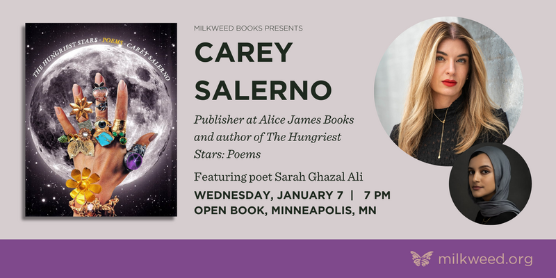 Milkweed Books presents Carey Salerno, publisher at Alice James Books and poet, to celebrate her newest collection, The Hungriest Stars. She will be joined by local poet Sarah Ghazal Ali for a reading and conversation, followed by book sales and signing.