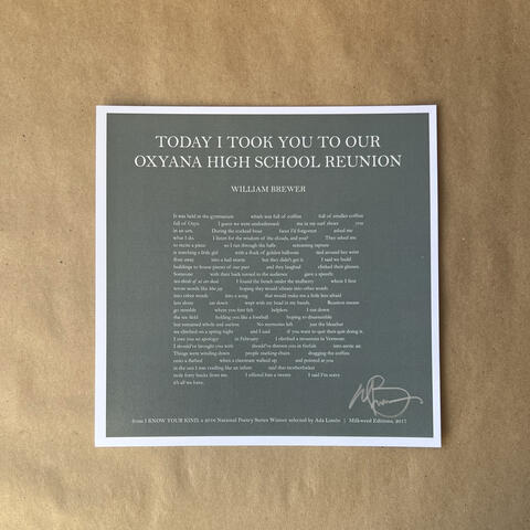 This signed broadside features the poem “Today I Took You to Our Oxyana High School Reunion” by Will Brewer from the book I Know Your Kind. Image Image Variations